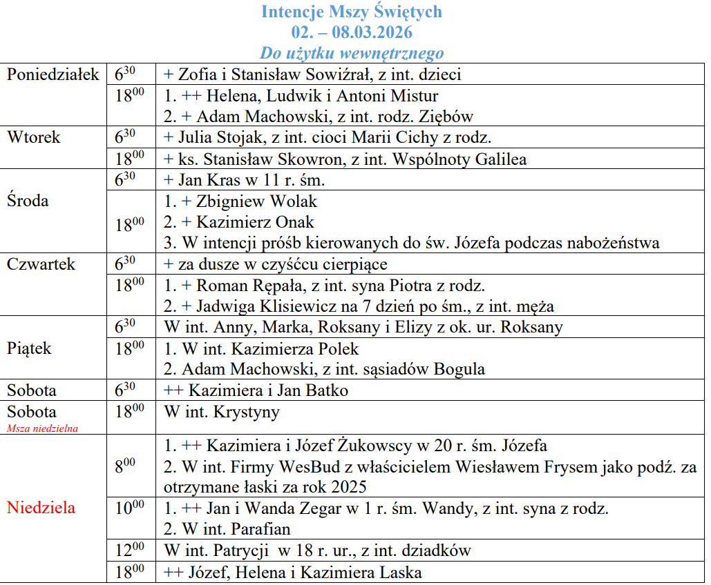 Intencje Mszy św. odprawianych od 27 kwietnia do 3 maja 2026 r.