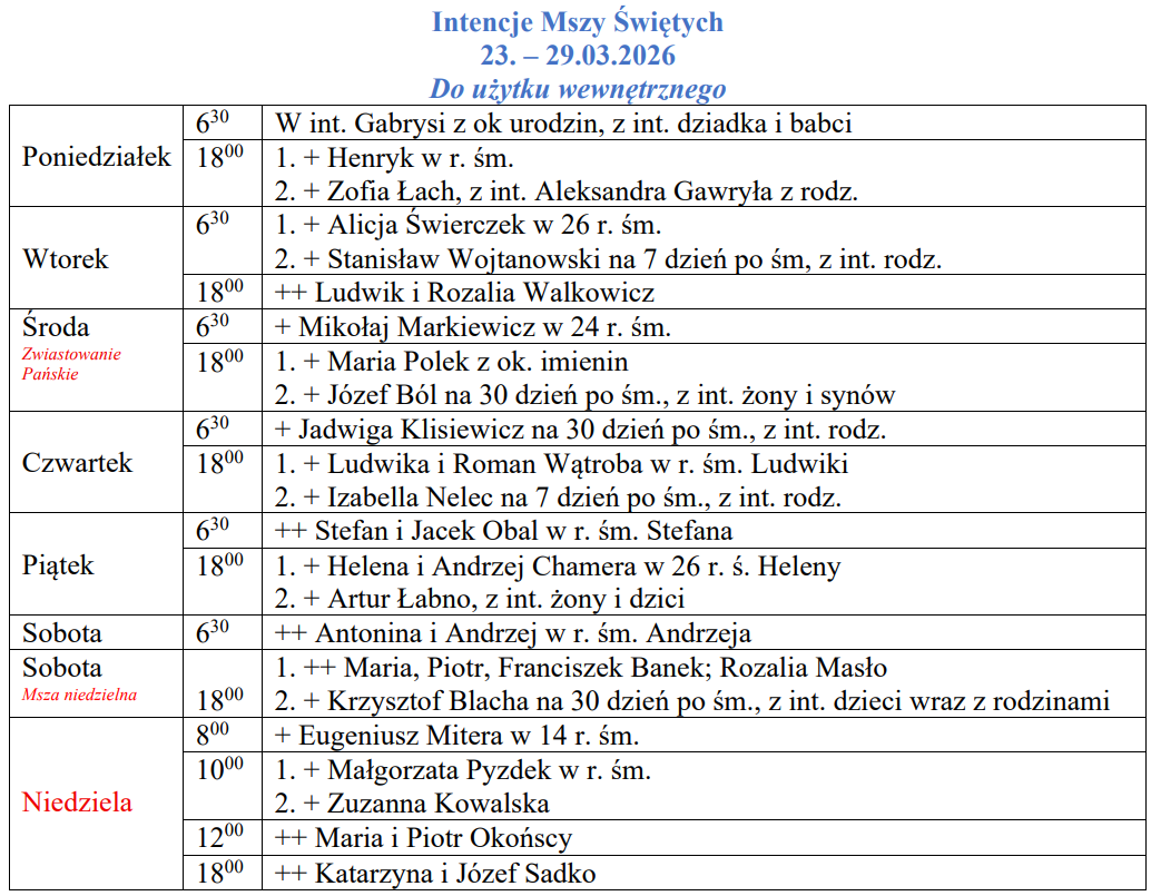Intencje Mszy św. odprawianych od 27 kwietnia do 3 maja 2026 r.