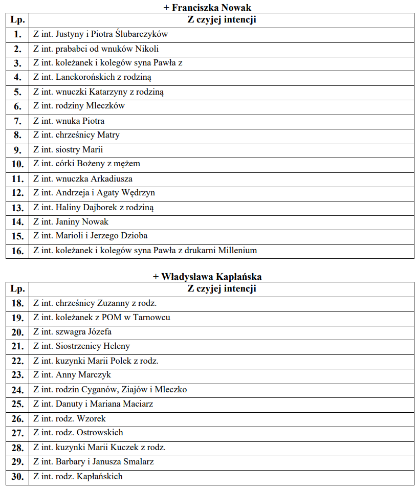 Msze św. odprawiane poza Parafią przez ks. Grzegorza Jelenia